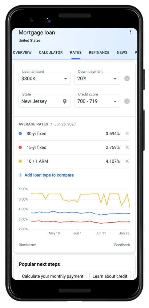 Google vient d’annoncer sur son blog la mise en place d’une nouvelle fonctionnalité sur les pages de recherche. Le moteur de recherche propose à ses utilisateurs aux USA une calculatrice hypothécaire.